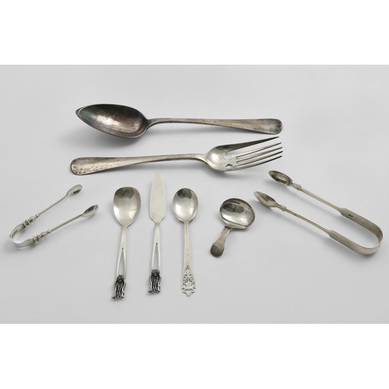 A pair of Dutch salad servers, two pairs of sugar tongs (one crested), a George III caddy spoon, initialled, a small Scottish spoon pierced with a thistle on the terminal and a colonial small spoon & butter knife with opal-set terminals, probably Australian; the knife 5.75" (14.5 cms) long; 10.5 oz (8)