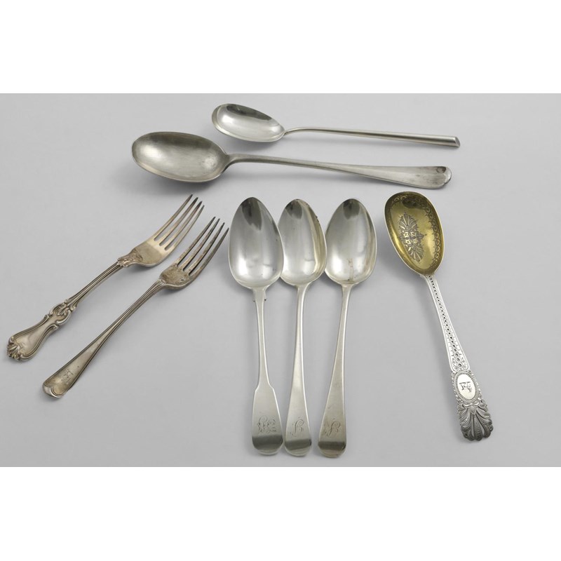 by Walker & Hall, Sheffield 1925, a pair and one single George III table spoons, all initialled, an engraved fruit-serving spoon with gilt bowl, crested, two antique table forks, and another serving spoon with a tapering, tubular handle; the latter 9.75" (24.5 cms) long; 23 oz (8)