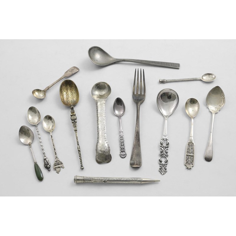 A silvergilt "Coronation" spoon, a jam spoon, seven other spoons, a coffee spoon with a nephrite-set terminal, a handmade "hammered" spoon, a George III dessert fork, a Norwegian pewter spoon and a pencil; the latter 4.5" (11.4 cms) long; 5.5 oz weighable silver (14)