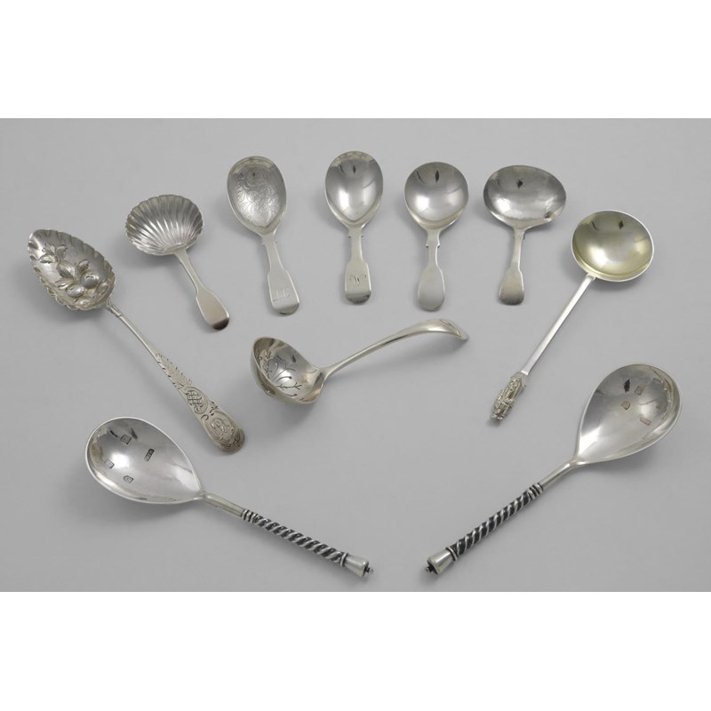 Five various caddy spoons (two initialled), a sugar sifter ladle, a "berry" spoon, an "apostle" spoon, two Scottish spoons with "twist" stems by R.E. Stone, Edinburgh 1958 and 1967; the latter two 5.75" (14.5 cms) long; 7.2 oz (10)