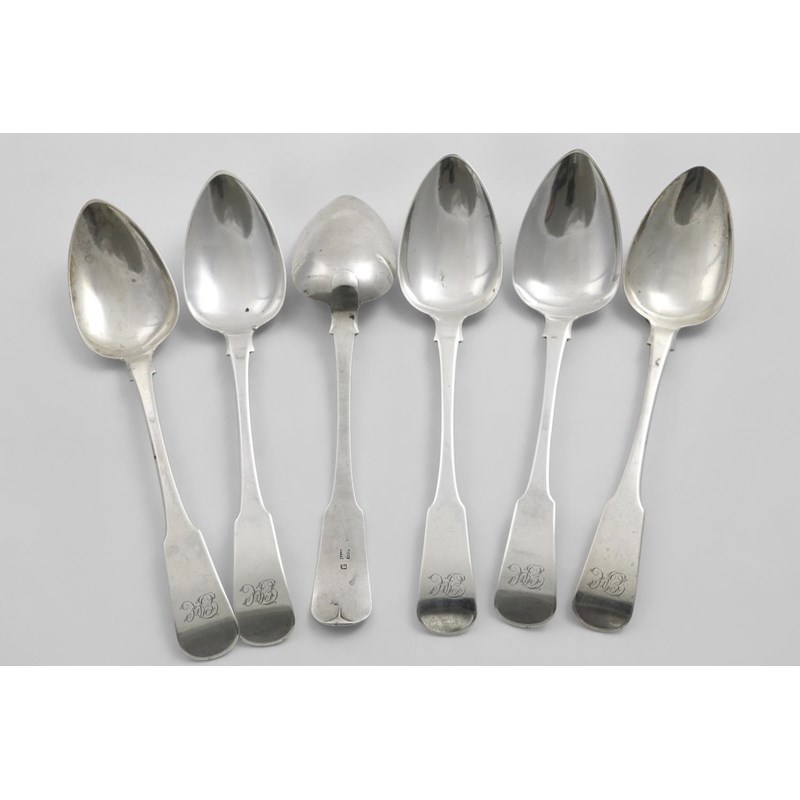 CHANNEL ISLES:- A set of six early 19th century Fiddle pattern table spoons, initialled, by George Hamon of Jersey 1820-30; 10.9 oz (6)