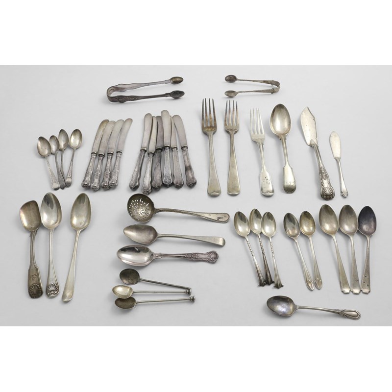 Two pairs of sugar tongs, three forks, two butter knives, a sugar spoon, three dessert spoons, a sugar sifter ladle, eighteen tea/coffee spoons and ten tea knives with plated blades; 26.5 weighable silver (lot)