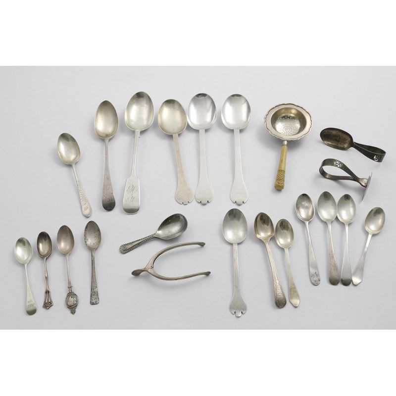 a pair of late Victorian Britannia-standard trefid table spoons, by T. Bradbury, London 1894, another later example, a child's pusher & spoon, a pair of sprung "wishbone" sugar tongs, twelve various small spoons, an ivory-handled tea strainer, two table spoons and a plated caddy spoon; the latter 3.75" (9.4 cms) long; 18.3 oz weighabe silver (lot)
