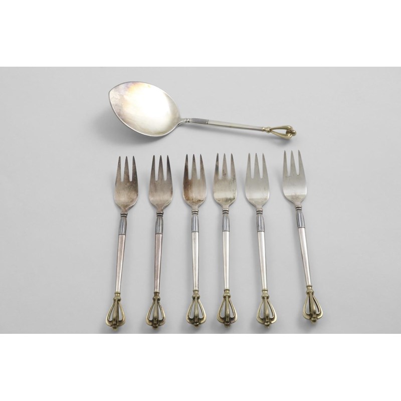 A 20TH CENTURY DANISH SET OF SIX CAKE FORKS & MATCHING SLICE with openwork, gilt finials, by W k& S. Sorensen, late 20th century; the slice 6.2" (15.7 cms) long; 6.1 oz (7)