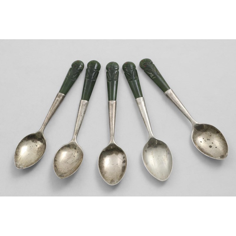 with nephrite upper stems, crudely carved with the Maori Hei-Tiki, maker's mark "J. Sands" for Joseph Swindell & Sons, of Christchurch c.1900; 3.75" (9.3 cms) long (5)