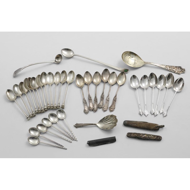 A set of twelve George V seal top tea spoons, by Mappin & Webb, Sheffield 1920/21, a set of six Art Deco coffee spoons, two sets of six tea spoons, a Victorian caddy spoon, a Norwegian spoon, a George III condiment ladle, three mounted steel pocket knives and a plated cocktail spoon with a bead-set terminal; the latter 7.9" (20 cms) long; 13.4 oz weighable silver (lot)