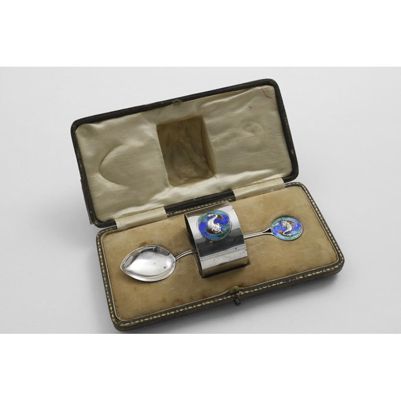 AN EDWARDIAN CASED NAPKIN RING AND SPOON