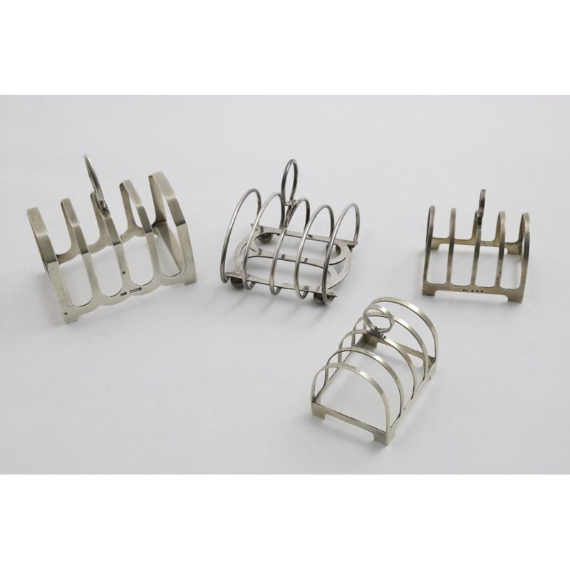 A PAIR OF GEORGE V SMALL TOAST RACKS with arched bars, by Deakin and Francis, Birmingham 1933, a larger rectangular toast rack and a Colonial toast rack; the small pair 2.7" (68 cms) long; 9.5 oz (4)