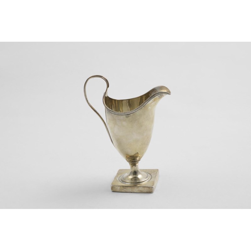 A GEORGE III PEDESTAL CREAM JUG with a reeded scroll handle & a helmet-shaped rim with a bead border, by Peter & Anne Bateman, London 1795; 5.7" (14.3 cms) high; 3.85 oz