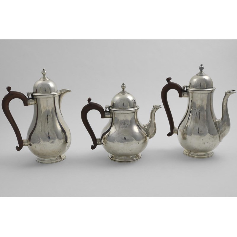 A GEORGE V TEA POT, COFFEE POT & HOT WATER JUG with baluster bodies and high-domed covers, each initialled "N", by E.J. Greenberg, London 1932; the larger two vessels 9.25" (23.5 cms) high; 65.6 oz (3)