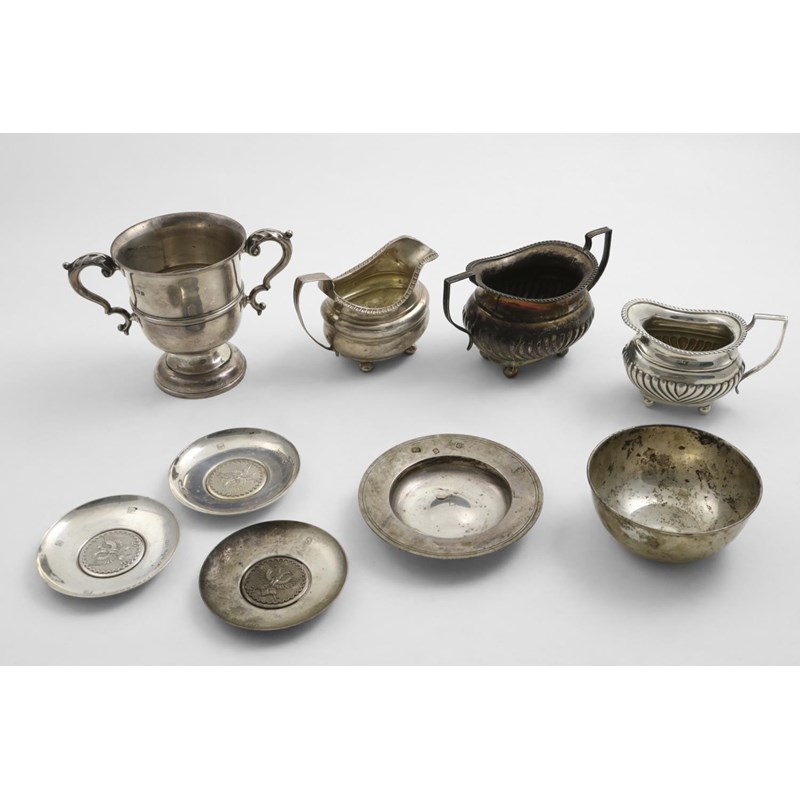 inscribed, by Adie Brothers Ltd., Birmingham 1928, together with a part-fluted milk jug and matching sugar basin, a George IV milk jug, a plain sugar bowl, an "Armada" dish and three small commemorative dishes with inset medallions; the trophy cup 4.8" (12 cms) high; 32.6 oz (9)