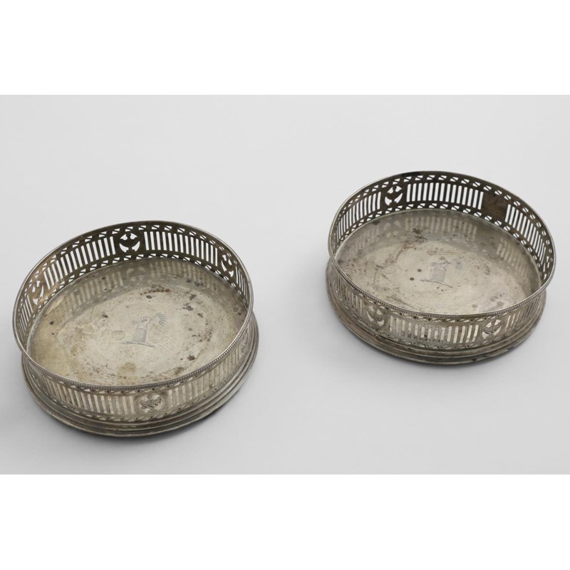 with fine-bead borders and inset wooden bases, the sides with urn motifs and a vacant cartouche, the centres crested, by Robert Hennell, London 1787; 5" (12.7 cms) diameter (2)