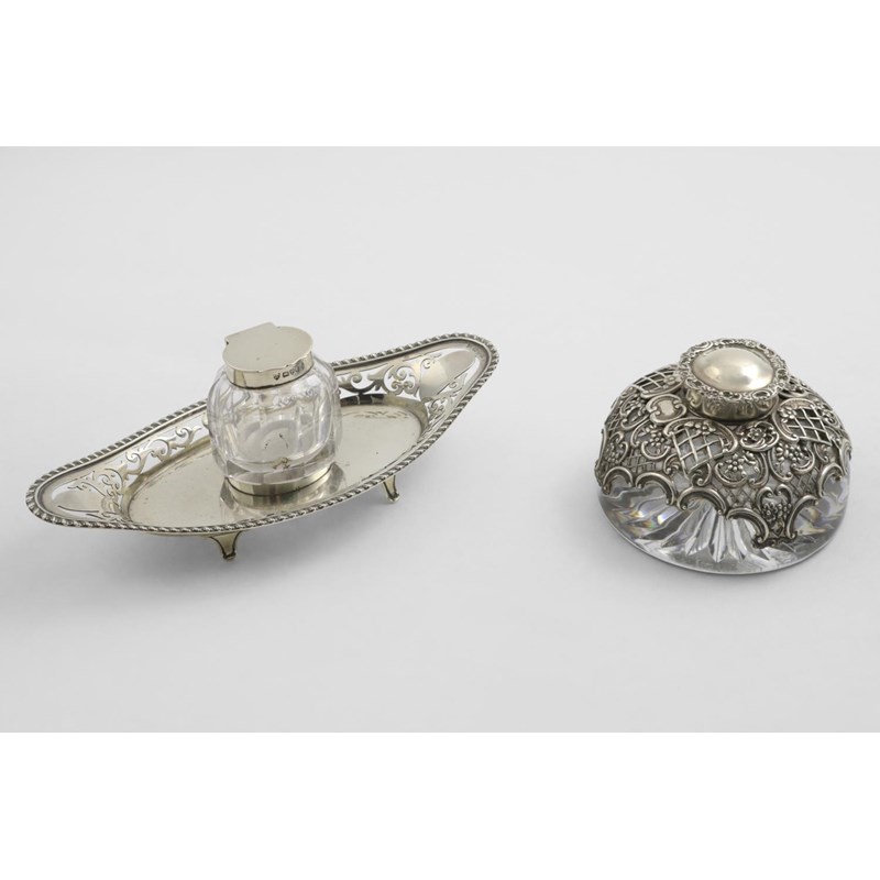 with an embossed mantle and a start-cut base, by William Comyns, London 1894, together with a boat-shaped inkstand by Messrs. Haseler and Haseler, Chester 1904; the latter 8.75" (22 cms) long; 4.5 oz weighable silver (2)