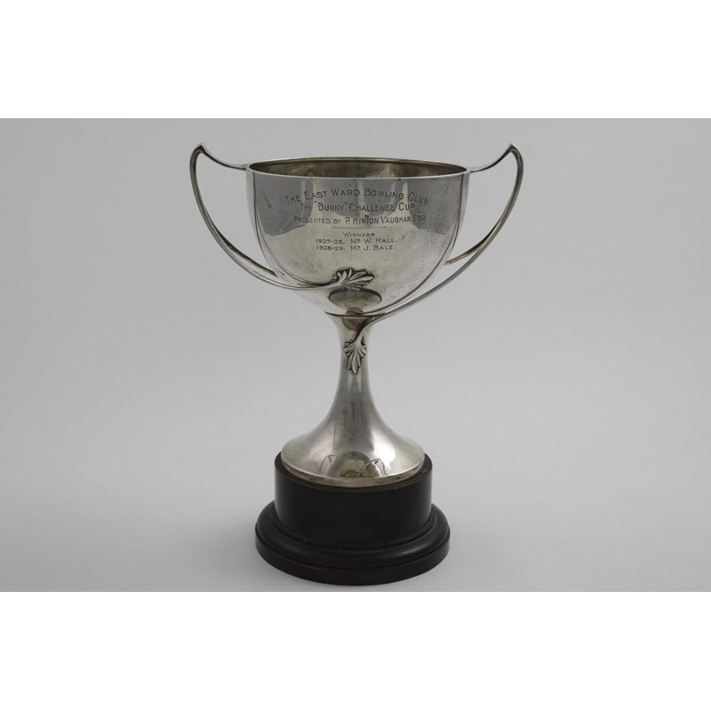 A GEORGE V TWO-HANDLED TROPHY CUP inscribed, by Edward Barnard & Sons Ltd., London 1925 (wooden plinth); 9.75" (24.5 cms) high; 20.8 oz