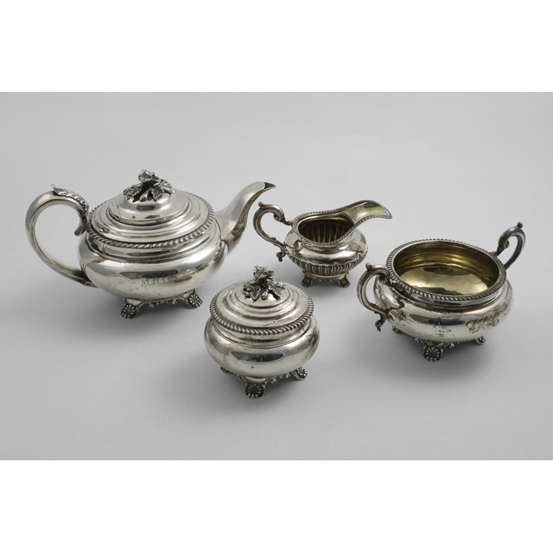 with squat circular bodies, gadrooned borders and decorative feet, initialled, together with a part-fluted cream jug, initialled, all of the above by Richard Pearce & George Burrows, London 1835/36/37; the caddy 5" (12.5 cms) high; 52.75 oz (4)