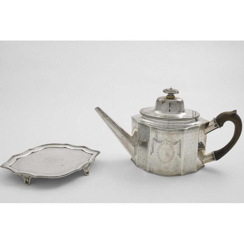 of shaped navette outline with bead borders, bright-engraved borders and a ground of engraved pelleted spots, the tea pot with a high-domed cover and an oval cartouche engraved on each side with drapery festoons, the stand one cartouche intialled "TH", by John Langlands and Jon Robertson, Newcastle 1788; the tea pot 6.5" (16.5 cms) high; 30.15 oz (2)