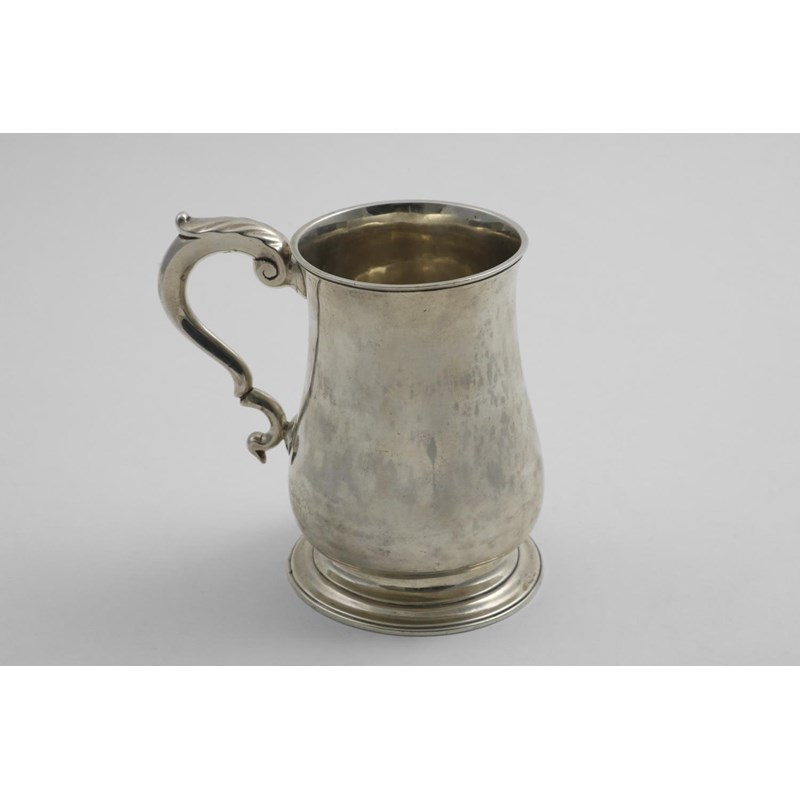 A late 18th century mug of baluster form on a spreading circular foot, with a leaf-capped, scroll handle, the base inscribed "Don de I.DLP a P.VB", maker's mark only "PA" (struck twice), by Pierre Amiraux of Jersey, last quarter of the 18th century; 5.2" (13 cms) high; 12.5 oz
