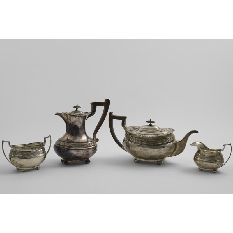 with rounded oblong bodies, gadrooned rims and button feet, by James Dixon & Sons of Sheffield, 1918, together with a matching hot water jug; the latter 8" (20.2 cms) high; 31.5 oz weighable silver (4)