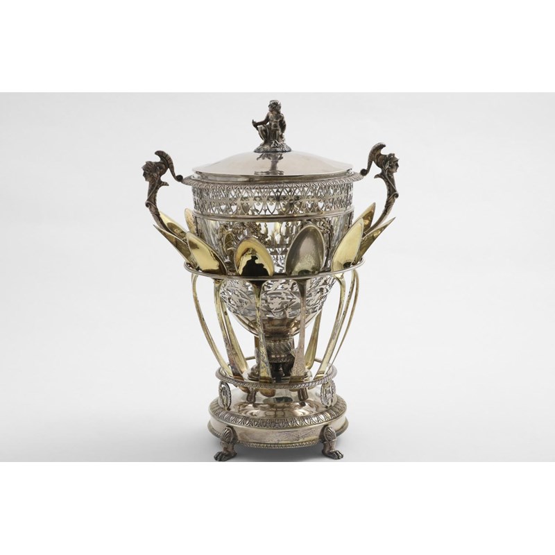 with twin handles, a figure finial and a non-matching glass liner, together with twelve French silvergilt tea spoons; the vase 10.4" (26.5 cms) high; 31.5 oz weighable silver