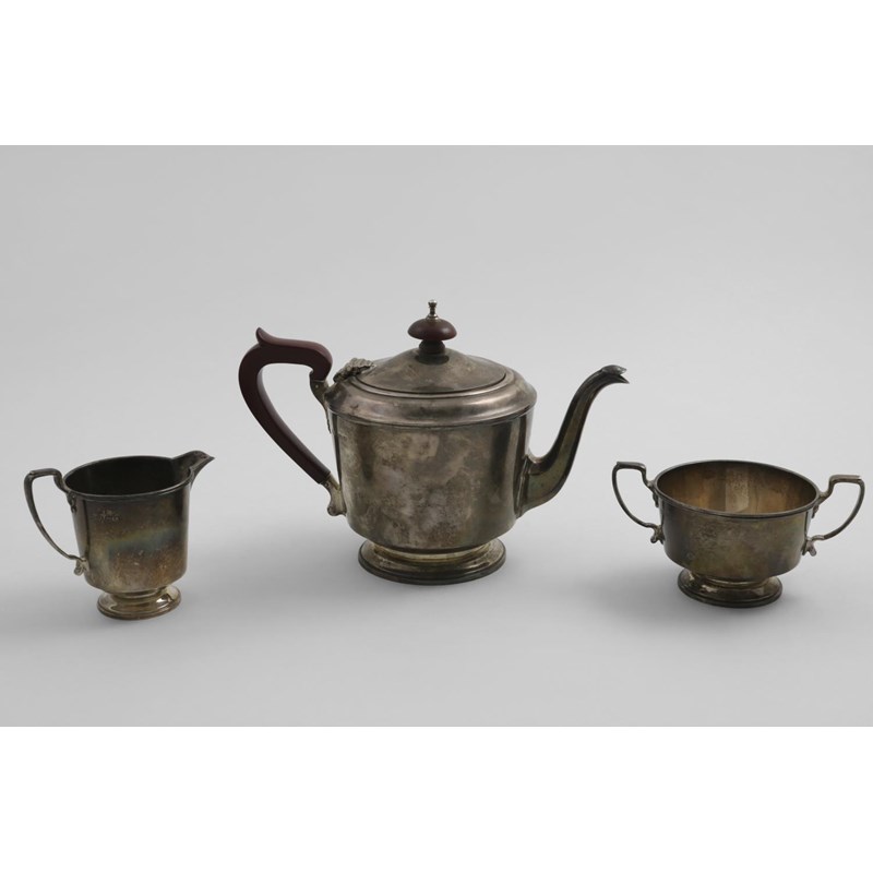 A WWII PERIOD THREE-PIECE TEA SET with circular bodies and circular pedestal bases, by Adie Brothers, Birmingham 1941; the tea pot 5" (13 cms) high; 15.7 oz (3)