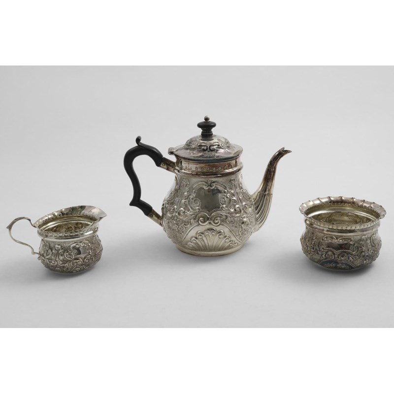 with embossed decoration and vacant cartouches, by G. Jackson & D. Fullerton, London 1898; the tea pot 5.7" (14.5 cms) high; 14.5 oz (3)