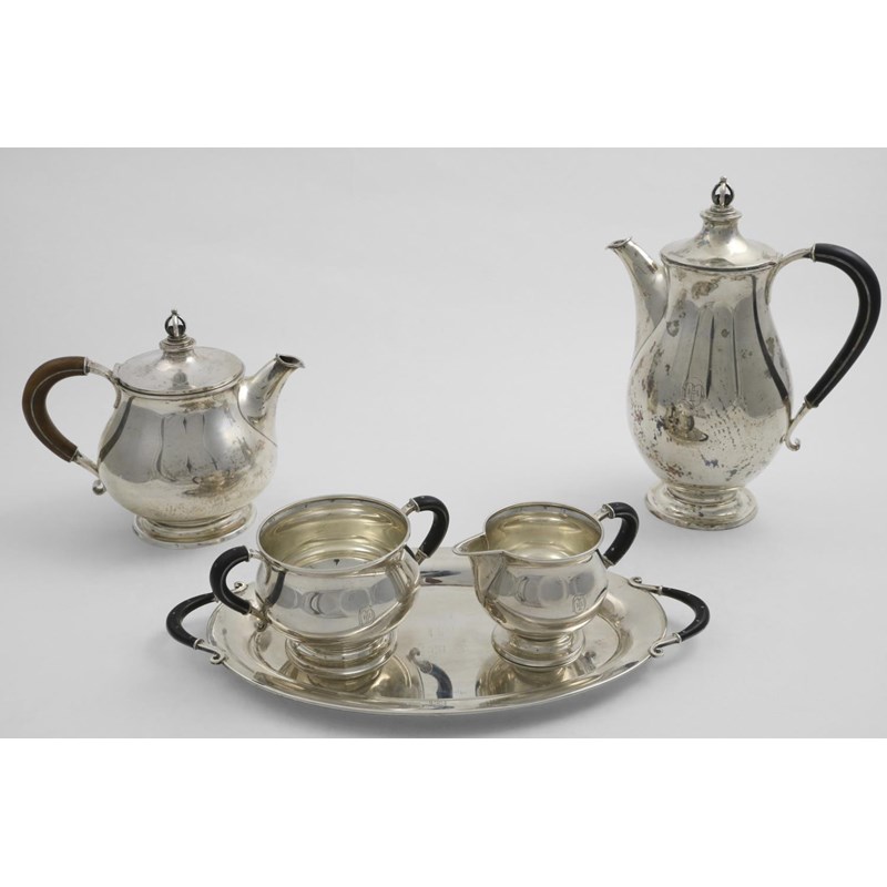 a bulbous coffee pot with a stylised crown finial and matching cream jug and sugar bowl, on a small oval tray, all with insulated, C-shaped handles, by Carl M. Cohr of Copenhagen 1930/31, together with a slightly later tea pot to match, by the same maker, Copenhagen 1950, each piece monogrammed to match; the tray 13.5" (34 cms) long; 58 oz (5)