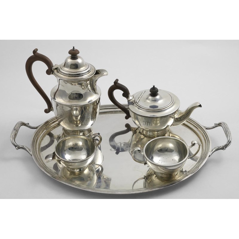 A GEORGE V FOUR-PIECE TEA SET AND TRAY the vessels with circular bodies, s-scroll handles and collet bases, all initialled "M", by W. Neale Ltd., Birmingham 1922/23/24/25; the tray 18.4" (46.8 cms) long; 67 oz (5)