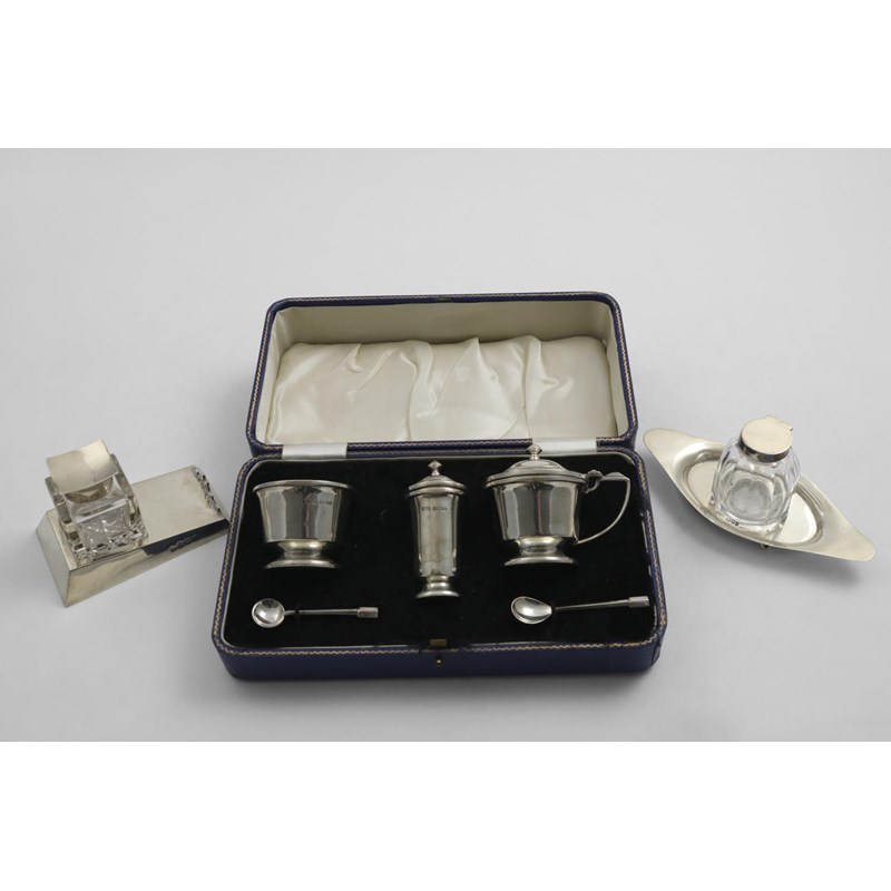 with two spoons and blue glass liners, by Duncan & Scobbie, Birmingham 1939, together with a small rectangular inkstand on a bevelled rectangular base, by W. Neale Ltd., Birmingham 1911 and another small inkstand by J.C. Vickery, London 1901; the latter 6" (15.1 cms) long; 6.85 oz weighable silver (3)