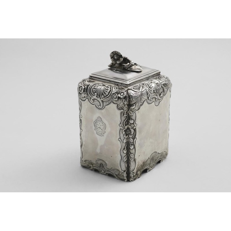 This tea caddy bears the Portal's first mark and was hallmarked during his first year as a registered large worker. Later on, Portal became an important figure in the literary scene, writing poetry and several major plays between 1758 and 1768, commenting on social, political and religious developments. He is one of the few Goldsmiths to appear in the Dictionary of National Biography on account of his literary activitues.
