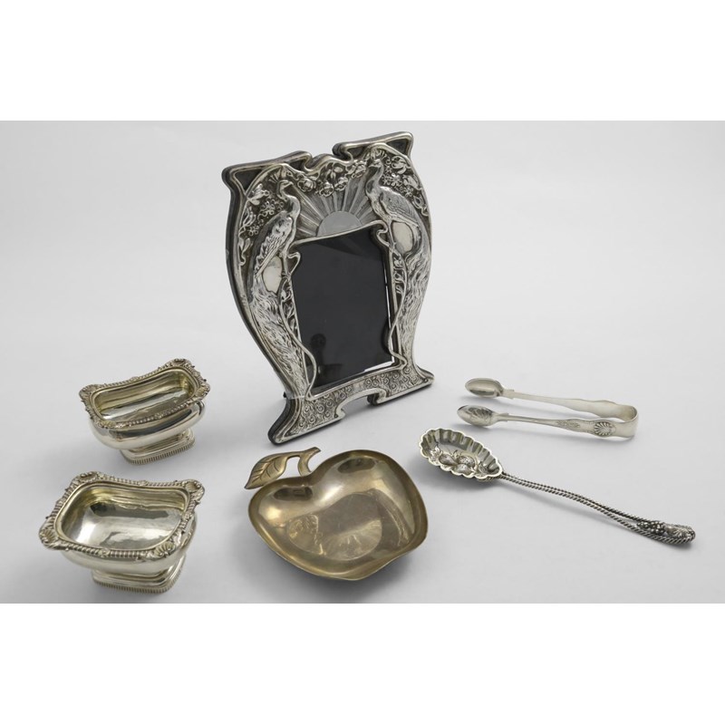 A late 20th century North American small dish, shaped like an apple, by Tiffany & Co. of New York, a photograph frame, two plated items and a pair of George III salts, crested, by Charles Price, London 1814/15; the frame 9" (22.5 cms) high; 13 oz weighable silver (6)