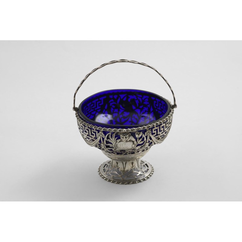 with pierced and embossed decoration, an animal mask cartouche, crested, and a blue glass liner, by William Bond, Dublin c.1770; 4.75" (12 cms) diameter; 4.8 oz weighable silver