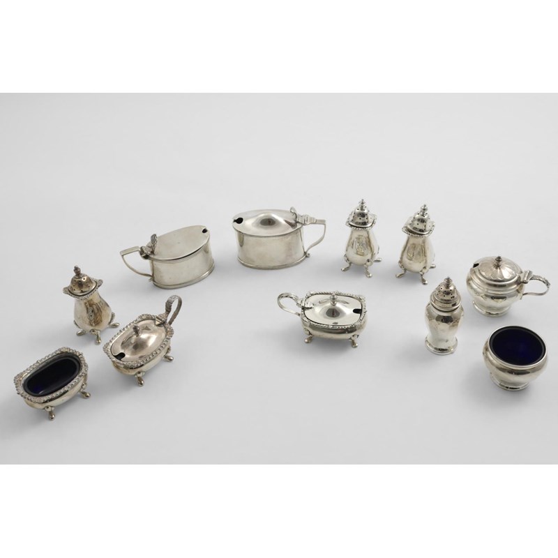 Two three-piece cruet sets (mustard, salt & pepper), with blue glass liners, two oval mustard pots with blue glass liners, and a pair of peppers and matching mustard pot with blue glass liner, mixed dates & makers; the larger mustard 3.5" (9 cms) long; 14.8 oz weighable silver (11)