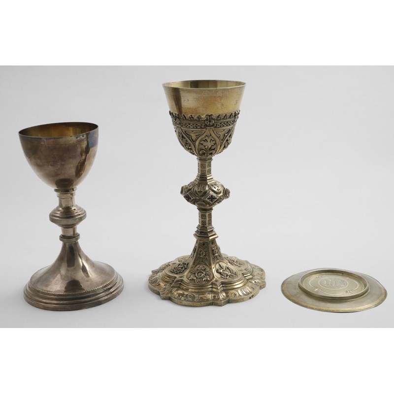 A LATE 19TH CENTURY FRENCH SILVERGILT, GOTHIC STYLE CHALICE (lacking its boss), with an associated paten, together with a plated chalice; the larger one 10" (25.5 cms) high; 19.7 oz weighable silver (2)