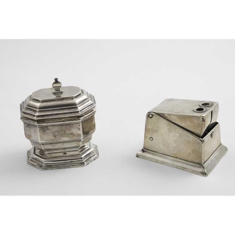 A SMALL LATE VICTORIAN OCTAGONAL TEA CADDY with moulded decoration by Charles Stuart Harris, London 1896 and a cigar cutter with an inscription at the back (metal innards); the caddy 4.4" (11.3 cms) high