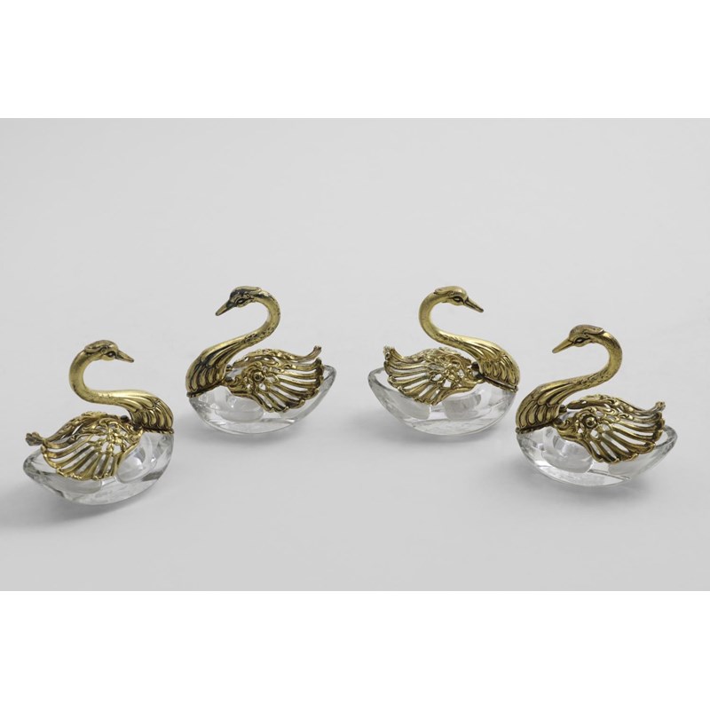 A SET OF FOUR LATE 20TH CENTURY CONTINENTAL SILVERGILT-MOUNTED GLASS SALTS in the form of swans with hinged wings; 2.8" (7.3 cms) high (4)