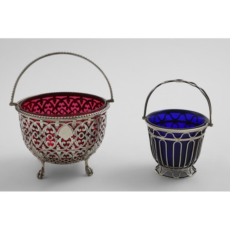 with ball & claw feet, pierced & engraved sides and a cranberry glass liner, by Cartwright & Woodward, Birmingham 1862 and a smaller wirework example with a blue glass liner by E.J. & N. Haselor, London 1900; the latter 2.75" (7 cms) high; 8.6 oz weighable silver (2)