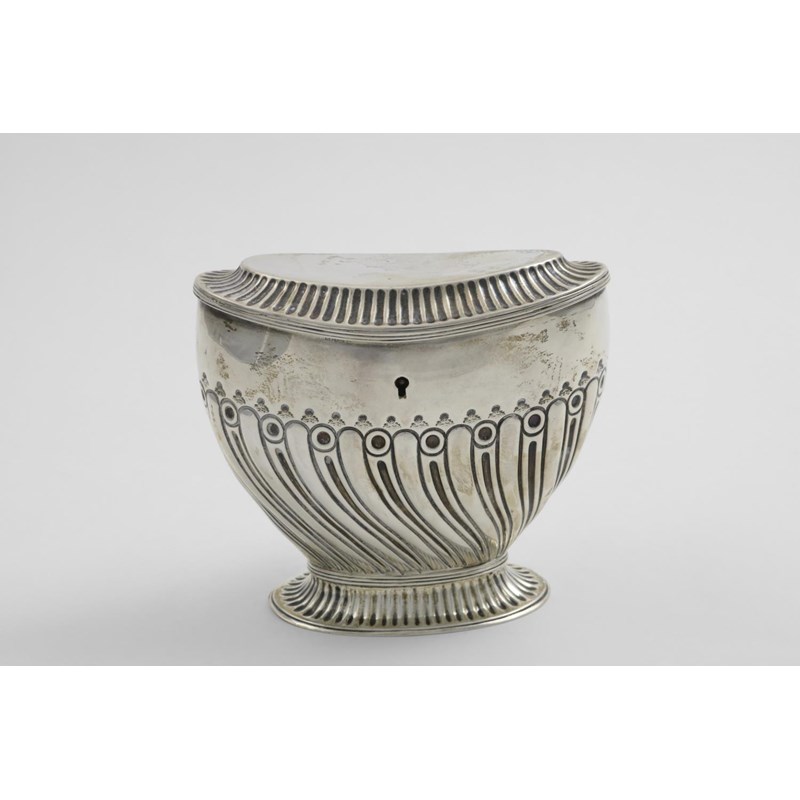oval with swirl fluting around the lower body and reeded decoration around the cover & foot, with lock, by William Comyns, London 1887; 4.6" (11.5 cms) high; 8.45 oz