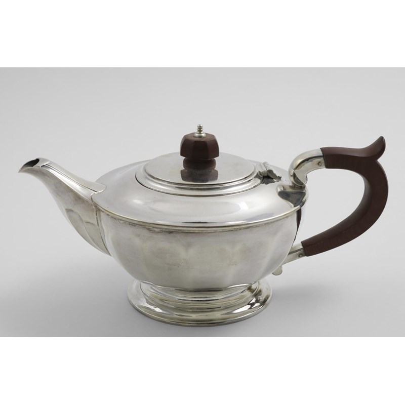 AN ELIZABETH II TEA POT circular with panelled decoration and a reddish brown composite handle & knop, by Mappin & Webb, Sheffield 1969; 5.3" (13.5 cms) high; 20.3 oz