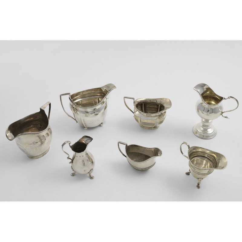 on ball feet, initialled, by Peter, Anne & William Bateman, London 1805, another George III cream jug with a flat base, initialled, and five other later cream jugs (one with a monogram), the largest one 4.75" (12 cms) high; 20.2 oz (7)
