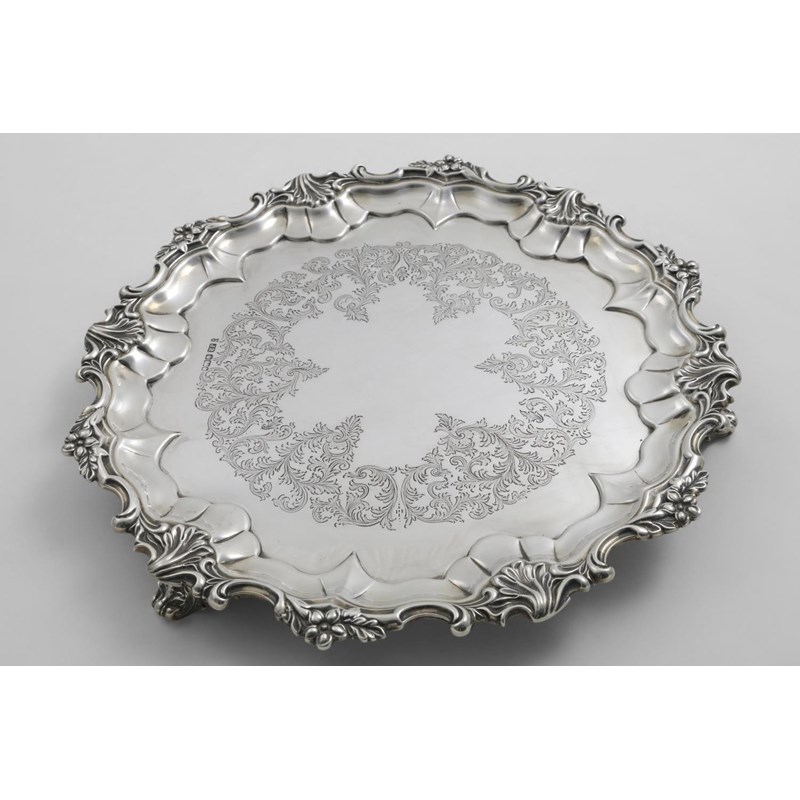 AN EDWARDIAN SALVER of shaped circular outline with a border of flowers, scrolls and shells, and an engraved centre, by Joseph Rogers, Sheffield 1903; 12.25" (31 cms) diameter; 27.9 oz