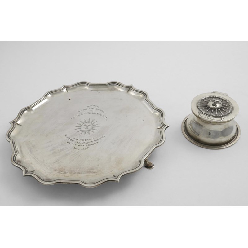 with the emblem of the Sun Alliance Assurance Society in relief on the cover, (cut-glass liner), by T. Bradbury & Sons, Sheffield 1933 and a George VI salver, Britannia Standard with a presentation inscription relating to Sun Alliance, by Birch & Gaydon, London 1937; the salver 12.25" (31 cms) diameter; 42.3 oz (2)