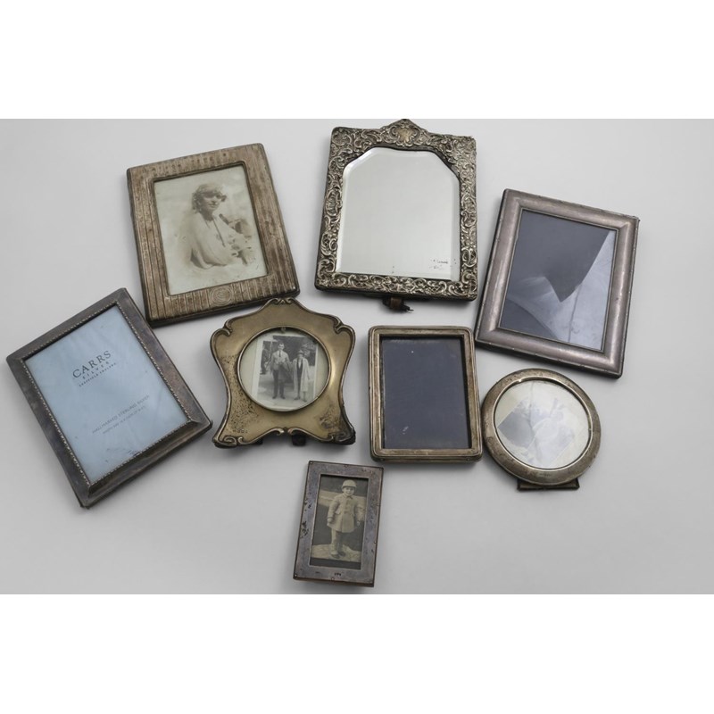 SEVEN VARIOUS MOUNTED PHOTOGRAPH FRAMES and a mounted easel mirror with bevelled glass insert, mixed makers & dates; the latter 10.75" (27 cms) high (8)