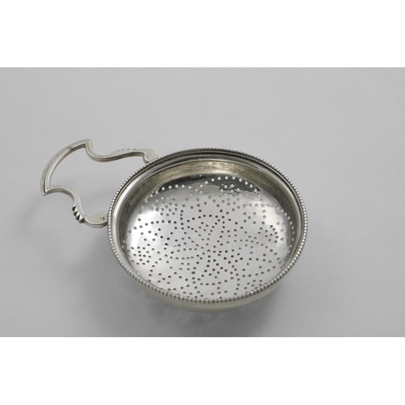 A GEORGE III LEMON STRAINER with a bead border and a shaped handle, by William Abdy (I), London 1779; 3.25" (8.3 cms) diameter; 1.65 oz