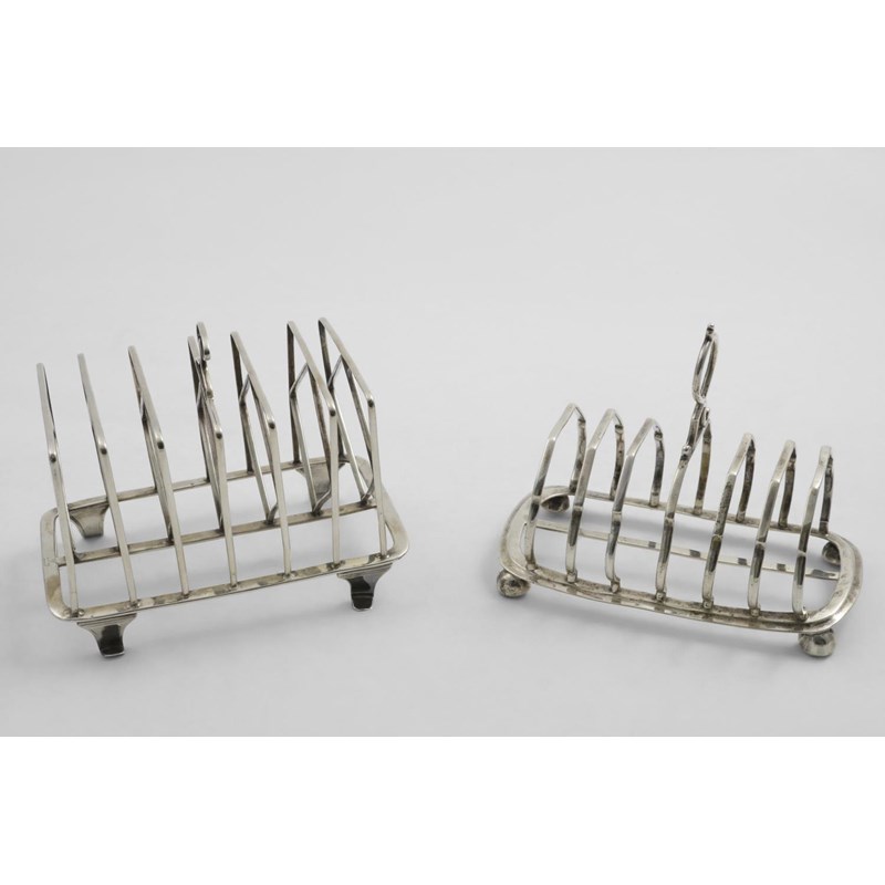 with seven angular bars and bracket feet, crested, by Alexander Goodman & Co., Sheffield 1805, and a Victorian toast rack on button feet, maker's mark "THH", London 1848; the latter 6.5" (16.5 cms) long; 16.5 oz (2)