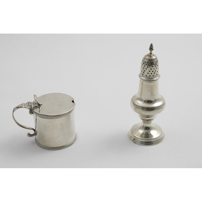 on a circular pedestal foot with a domed cover and wrythen finial, by Thomas Shepherd, London 1784, and a George III drum mustard pot with bead borders and a blue glass liner, by Samuel Meriton, London 1775; the latter 3" (7.6 cms) high; 6.75 oz weighable silver (2)