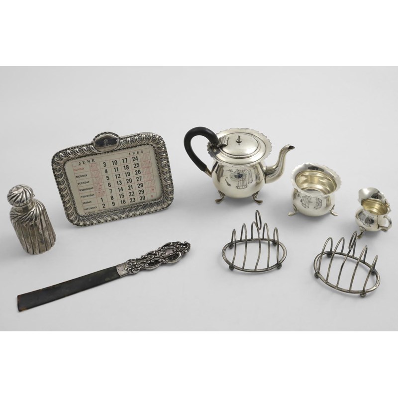 circular with shaped, cut rims, maker's mark "M&Co", Birmingham 1803, together with a calendar frame, a pair of small toast racks, a mounted letter opener & a toilet water bottle; the tea pot 4.56" (10.3 cms) high; 13.25 oz weighable silver (8)