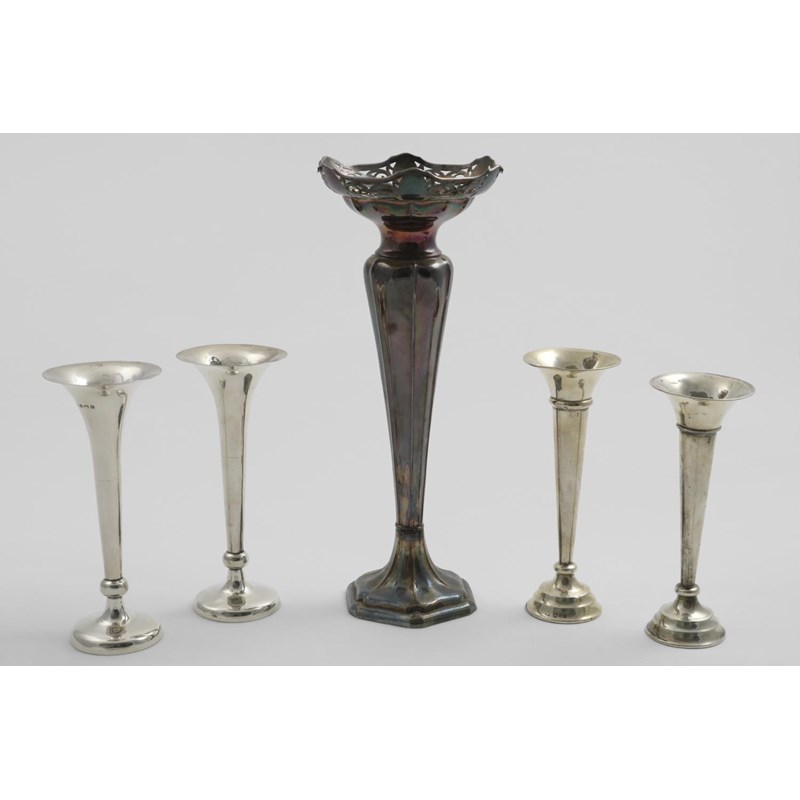 A GEORGE V VASE with a pierced top, by the Alexander Clarke Co., Birmingham 1923, loaded, a pair of Edwardian small trumpet vases, and two other small vases, loaded; the largest one 10.9" (27.5 cms) high (5)