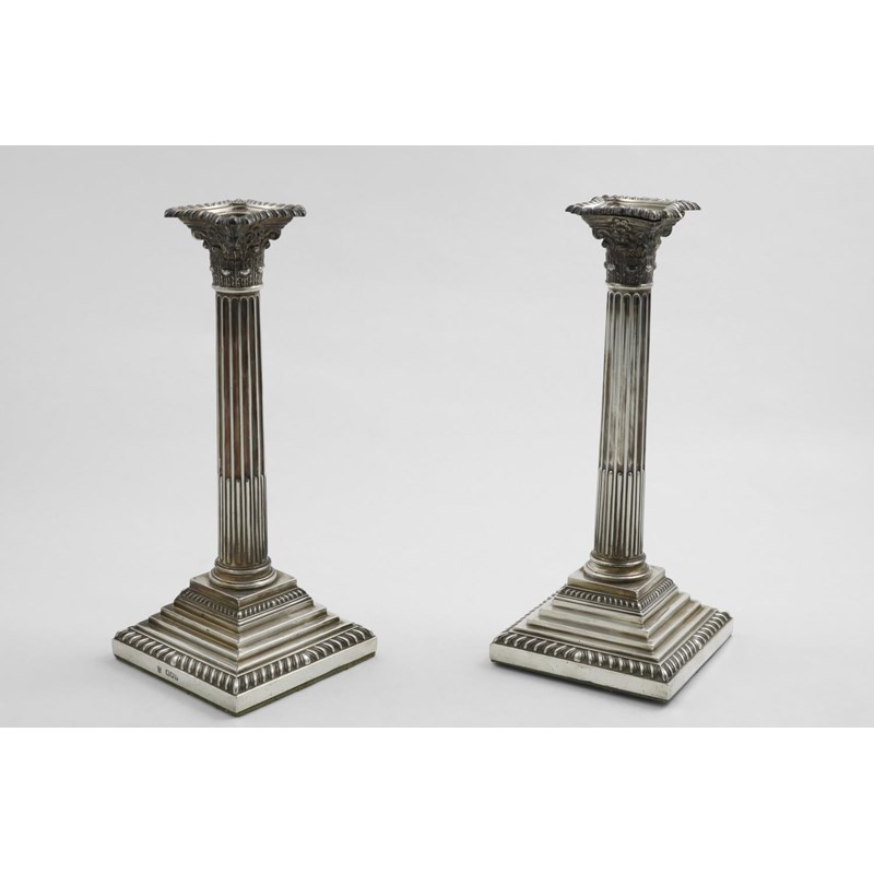A PAIR OF LATE VICTORIAN CANDLESTICKS with fluted columns, Corinthian capitals and stepped square bases with gadrooned borders, detachable nozzles, by Charles Stuart Harris, London 1897 (loaded); 11.75" (30 cms) high (2)