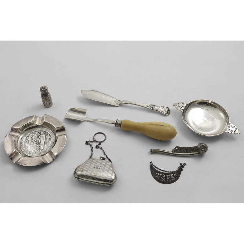A Victorian ivory-handled cheese scoop, initialled "BP", by Martin Hall & Co., Sheffield 1861, an ash tray, a purse, initialled, a nut dish, a small scent bottle, a butter knife, initialled, a wine label and a plated bosun's whistle; the latter 4" (10 cms) long; 6.25 oz weighable silver (8)