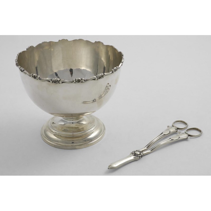 on a domed circular foot with an applied shell & scroll rim, maker's mark "HP", London 1922, together with a pair of grape shears by Mappin & Webb, Sheffield 1896; the rose bowl 6" (15.2 cms) diameter; 12.1 oz (2)